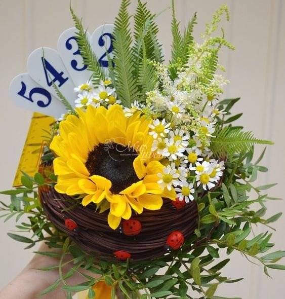 Подсолнух - 3 шт Верон - 5 шт Хризантема - 3 шт Аспидистра - 3 шт Салал Упаковка сизаль Лента атлас