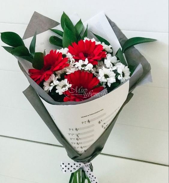 Гербера Хризантема кустовая Рускус Упаковка крафт Декор на тему школа Лента атлас