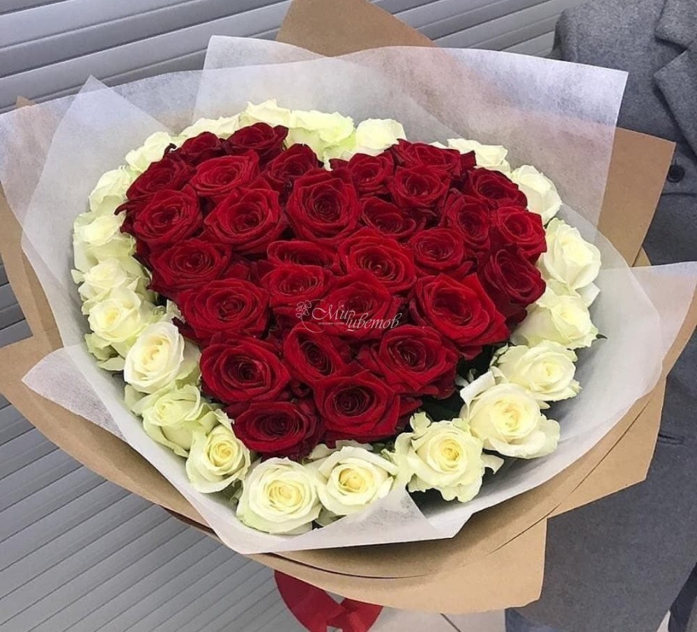 Роза бордовая 27 шт Роза белая 22 шт Упаковка Лента атлас