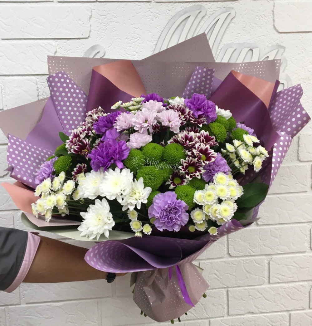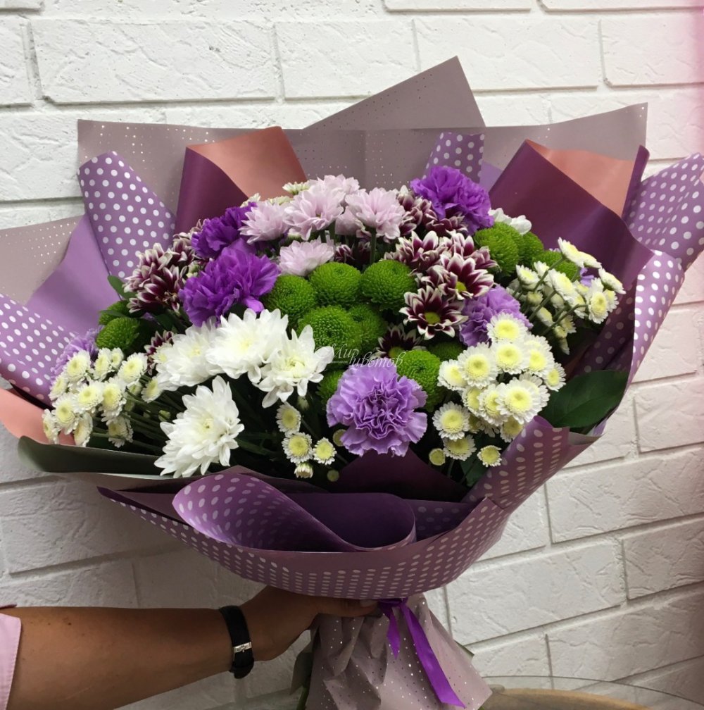 Хризантема кустовая 15 шт Лунная гвоздика - 9 шт Упаковка пленка матовая Лента атлас