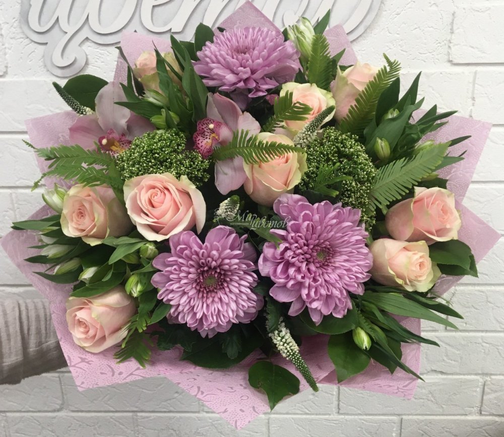 Роза Хризантема Альстромерия Цимбидиум Трахелиум Верон Умбрела Зелень Упаковка фетр Лента атлас