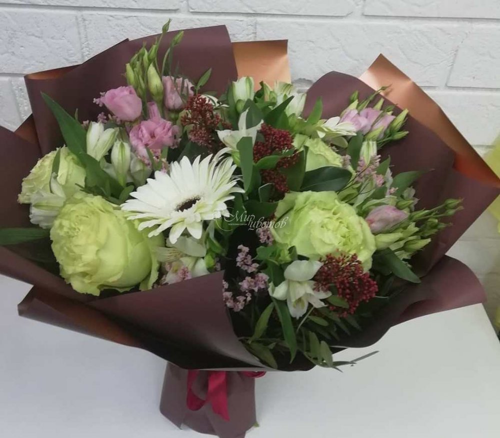 Роза Эустома Альстромерия Гербера Скимия Зелень Упаковка пленка матовая Лента атлас