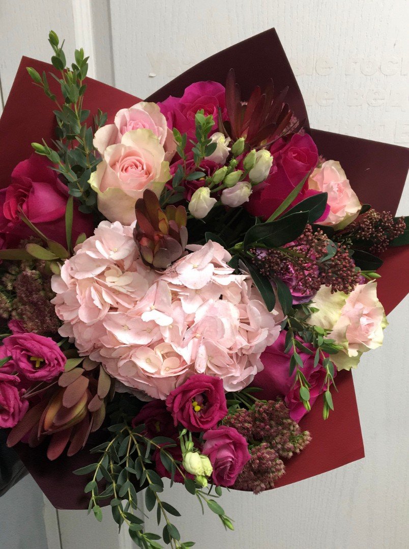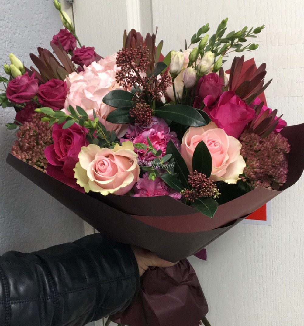 Роза Гортензия Седум Эустома Скимия Леукондендрон Эвкалипт Зелень Пленка матовая Лента атлас