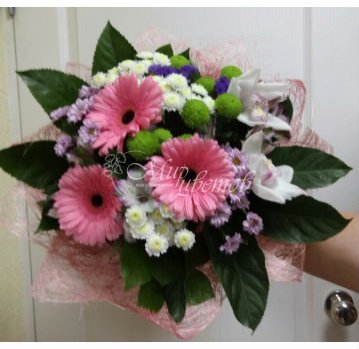 Гербера - 3 шт Цимбидиум - 2 шт Хризантема кустовая - 5 шт Салал Фатсия - 3 шт Упаковка сизаль Лента атлас