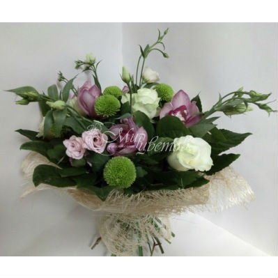 Цимбидиум - 3 шт Роза белая - 4 шт Эустома - 3 шт Хризантема кустовая - 3 шт Салал Фатсия - 3 шт Упаковка сизаль Лента атлас