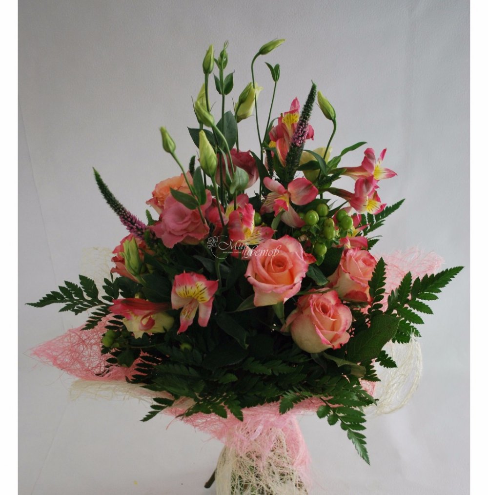 Роза розовая - 5 шт Эустома - 3 шт Альстромерия - 5 шт Верон - 5 шт Гиперикум зеленый - 3 шт Зелень Салал Упаковка сизаль Лента атлас