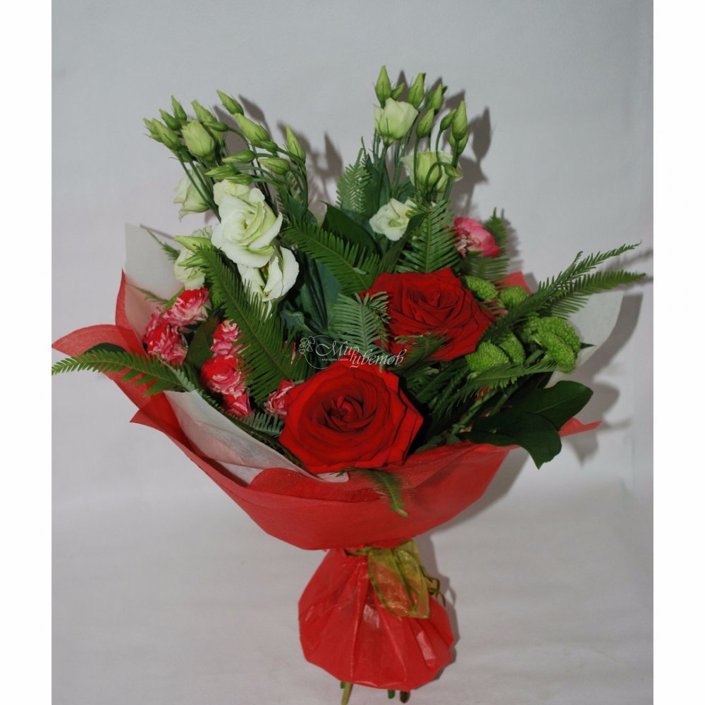 Хризантема одноголовая - 3 шт Эустома - 3 шт Роза кустовая - 3 шт Роза - 5 шт Пленка матовая Лента атлас