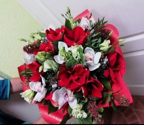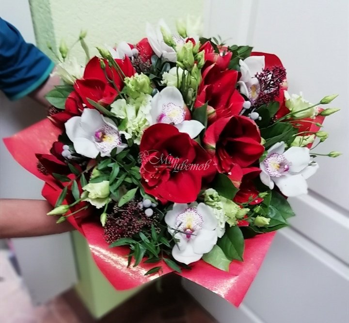 Амарилис Цимбидиум Эустома Скимия Фисташка зелень Упаковка Лента атлас