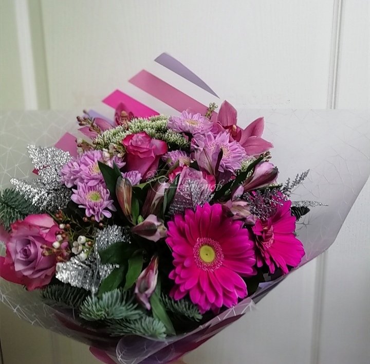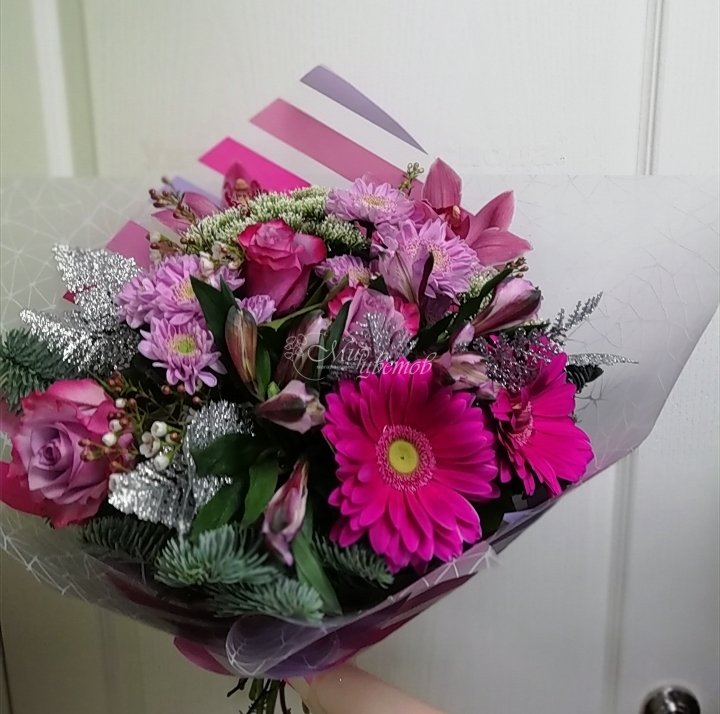 Розы Кустовые розы Герберы Альстромерии Гвоздики Зелень Пленка матовая Лента атлас