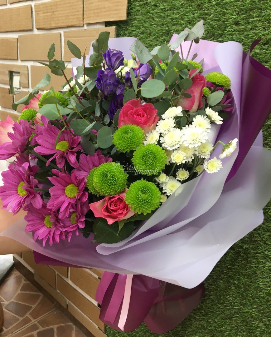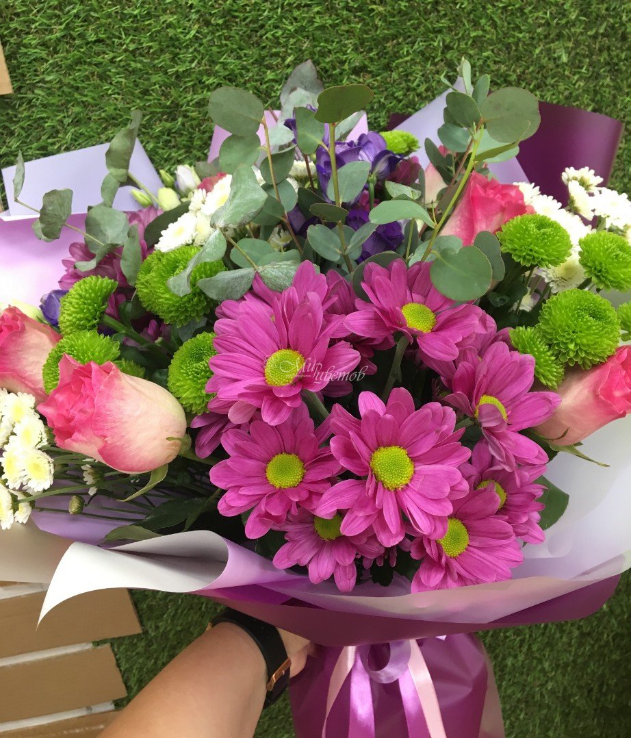 Роза Гербера Алиум Хризантема кустовая Эустома Эвкалипт Матовая пленка Лента атлас