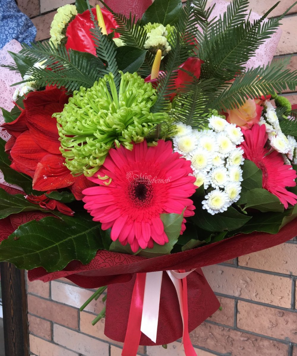 Амарилис Антуриум Гербера Хризантема кустовая Хризантема одноголовая Роза Умбрела Зелень Фатсия Упаковка Лента атлас