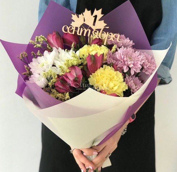 Альстромерия Хризантема кустовая Статица Гвоздика Зелень Упаковка Лента атлас вставка топпер