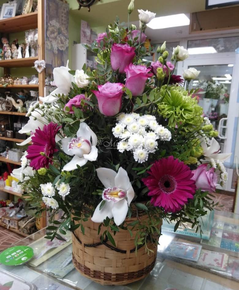 Корзина Роза Эустома Орхидея Гербера Хризантема Фисташка
