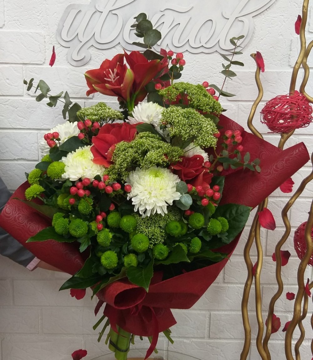 Амариллис Хризантема кустовая Хризантема Гиперикум Эвкалипт Трахелиум Зелень Упаковка Лента атлас