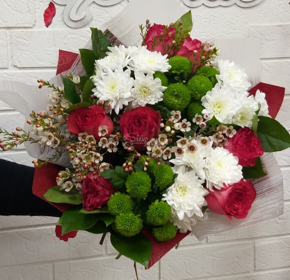 Амарилисы Розы Хиперикум Хризантема кустовая Зелень Матовая пленка Лента атлас