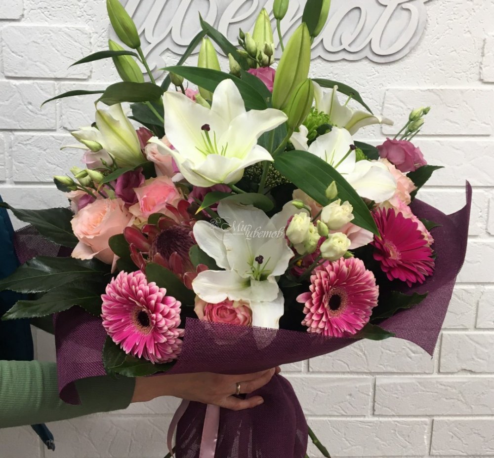 Лилия Эустома Роза Протея Гербера Хризантема Трахелиум Фатсия Упаковка джут Лента атлас