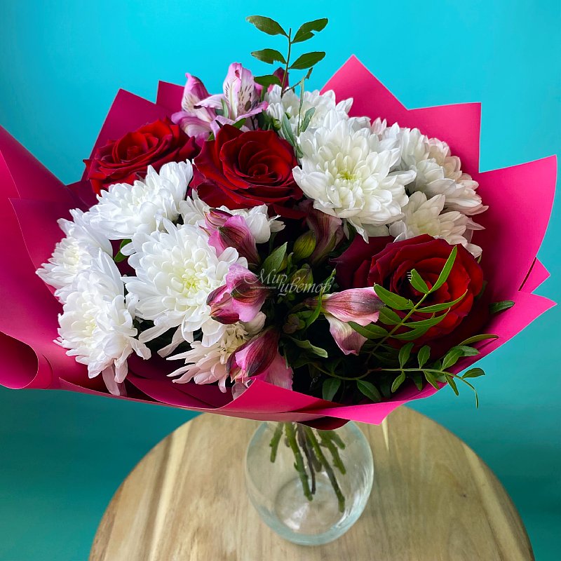 Хризантема кустовая - 2 шт Альстромерия - 2 шт Роза - 3 шт Зелень Пленка матовая лента атлас