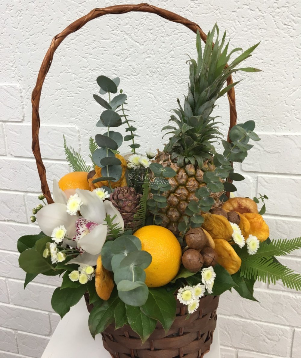 Корзина Фрукты,орехи,сухофркуты (по желанию заказчика) Орхидея Хризантема Эвкалипт Зелень Умбрела