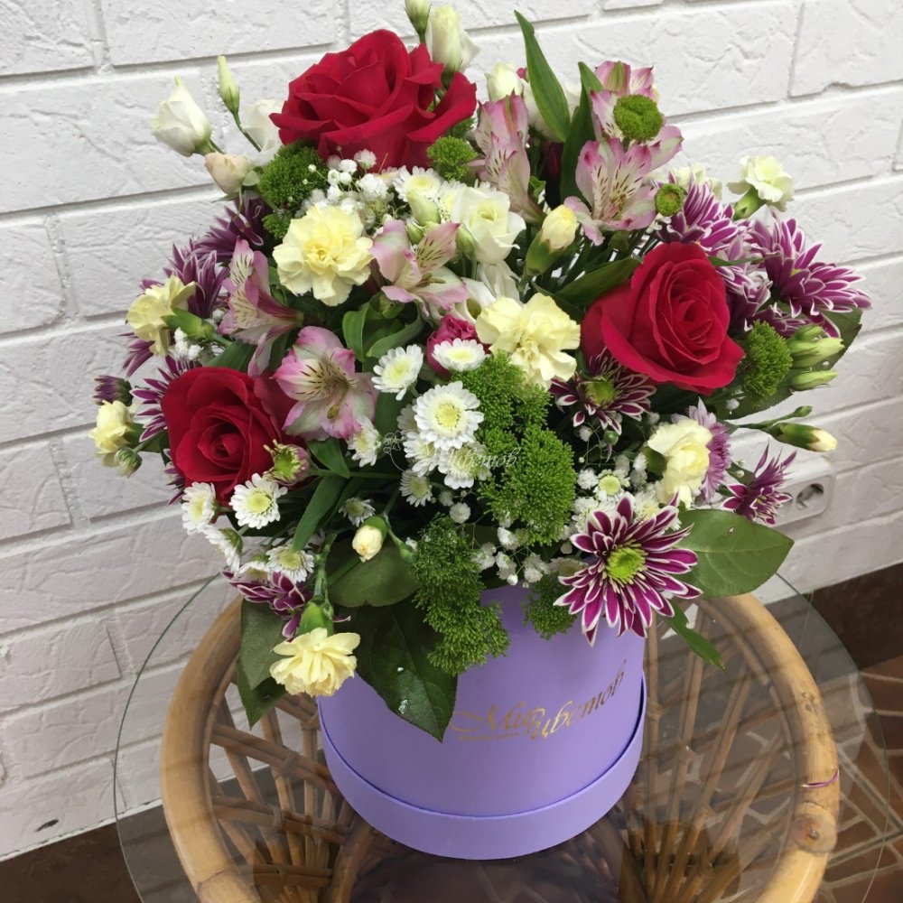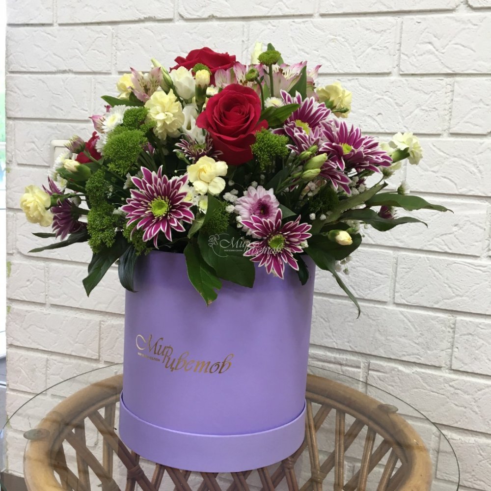 Коробка Роза Хризантема кустовая Трахелиум Альстромерия Эустома Зелень