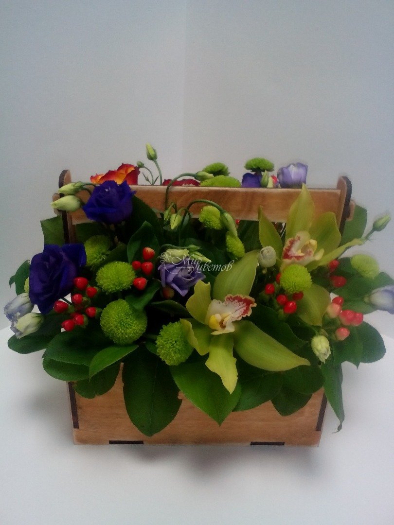 Ящик Цимбидиум Эустома Гиперикум Хризантема Зелень
