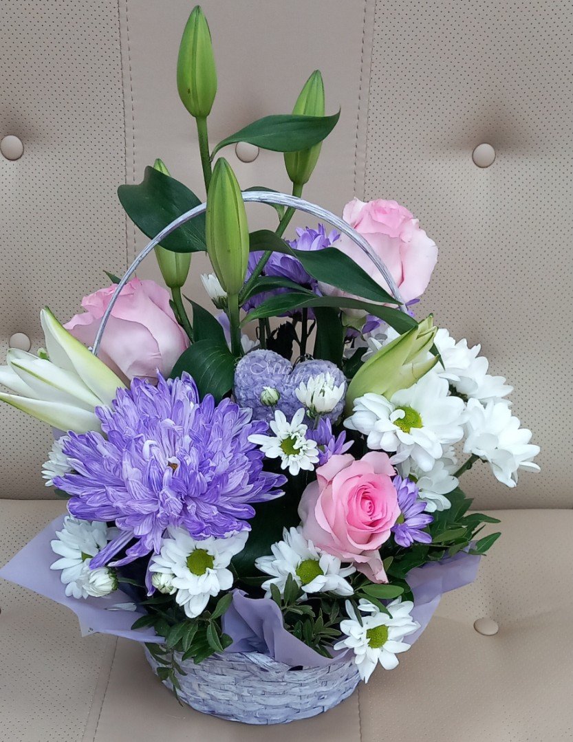 Нежная корзина из лилии, хризантемы и гвоздики