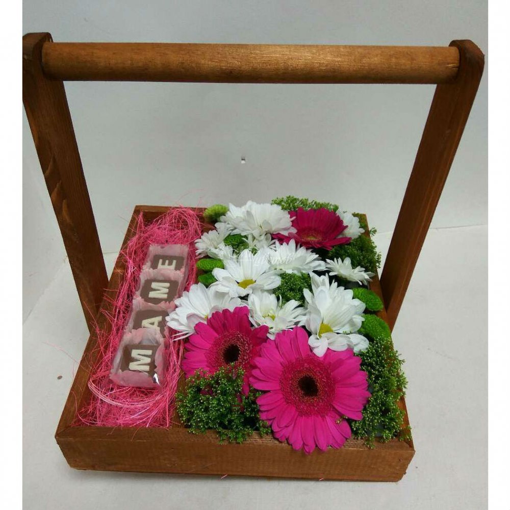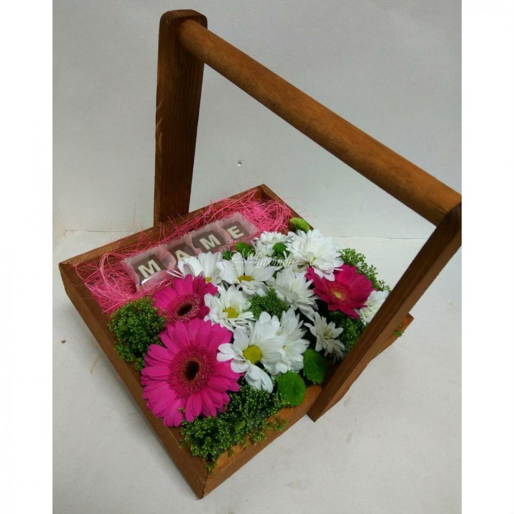 Корзинка Гербера - 1 шт Хризантема - 1 шт Эустома - 1 шт Зелень Цветы в композиции могут быть заменены на равноценные, по усмотрению флориста.