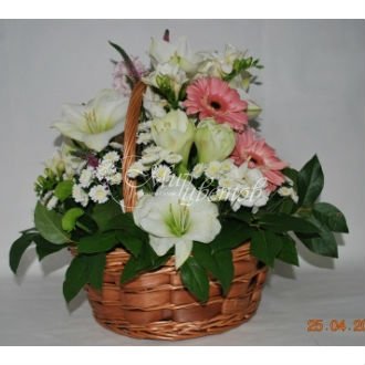 Корзина Гербера - 4 шт Роза -5 шт Альстремерия - 5 шт Салал Цветы в композиции могут быть заменены на равноценные, по усмотрению флориста.
