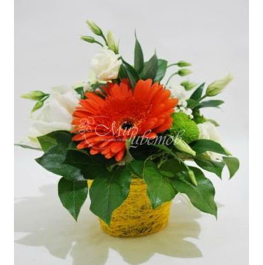 Корзинка Гербера - 1 шт Хризантема - 1 шт Эустома - 1 шт Зелень Цветы в композиции могут быть заменены на равноценные, по усмотрению флориста.