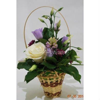 Корзинка Роза белая - 1 шт Эустома - 1 шт Гиацинт - 1 шт Зелень Цветы в композиции могут быть заменены на равноценные, по усмотрению флориста.