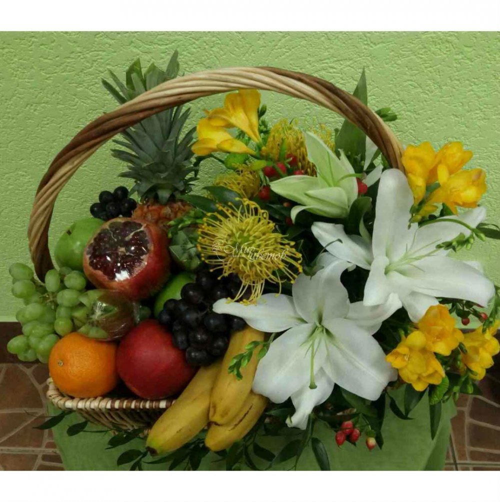 Корзина Фрукты Лилия Фрезия Леукосперикум Гиперикум Цветы в композиции могут быть заменены на равноценные, по усмотрению флориста.