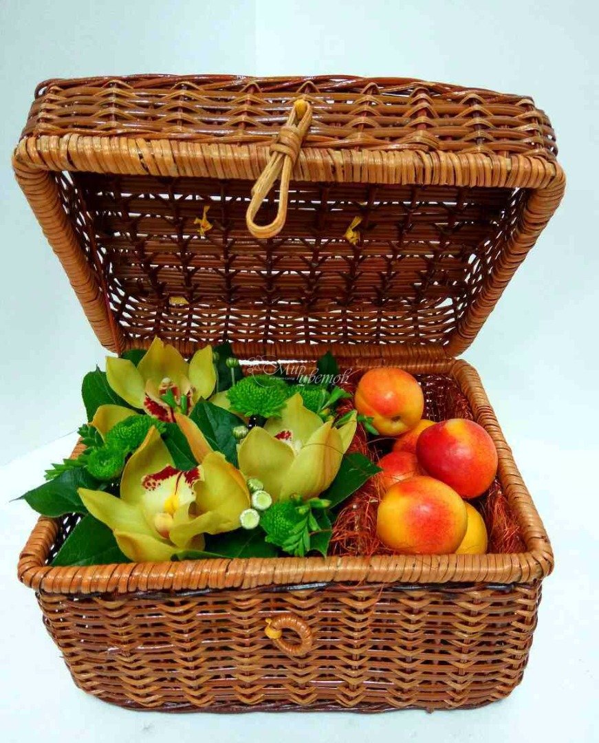 Корзина - сундук Фрукты зависят от время года (персики яблоки мандарины и т.д.) Цимбидиум - 3 шт Хризантема - 2 шт Зелень