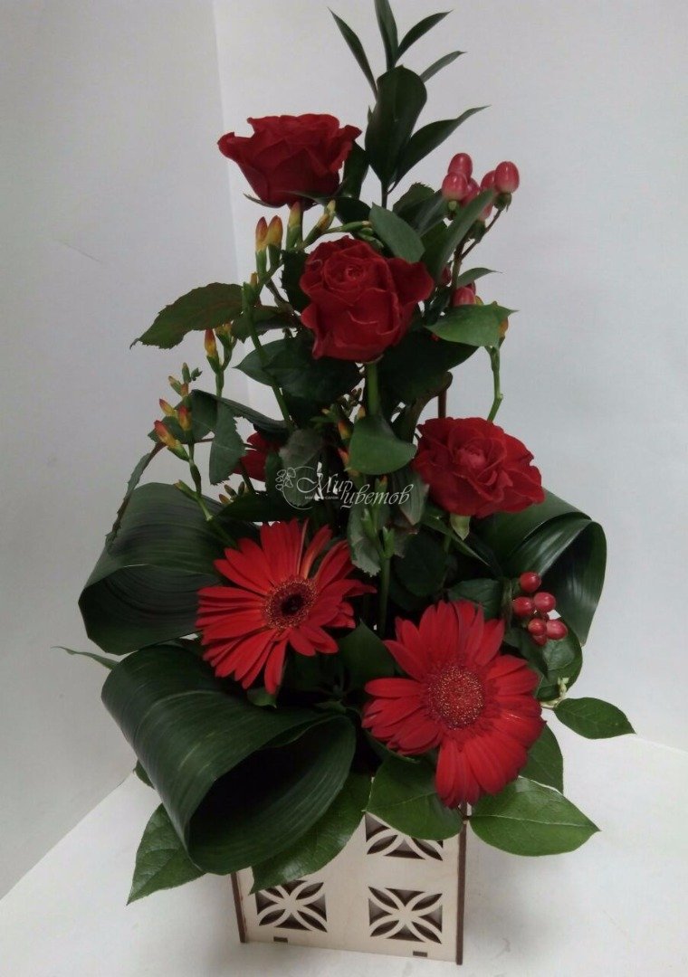 Ящик - 1 шт Роза бордовая - 4 шт Гербера красная - 3 шт Гиперикум красный - 2 шт Зелень