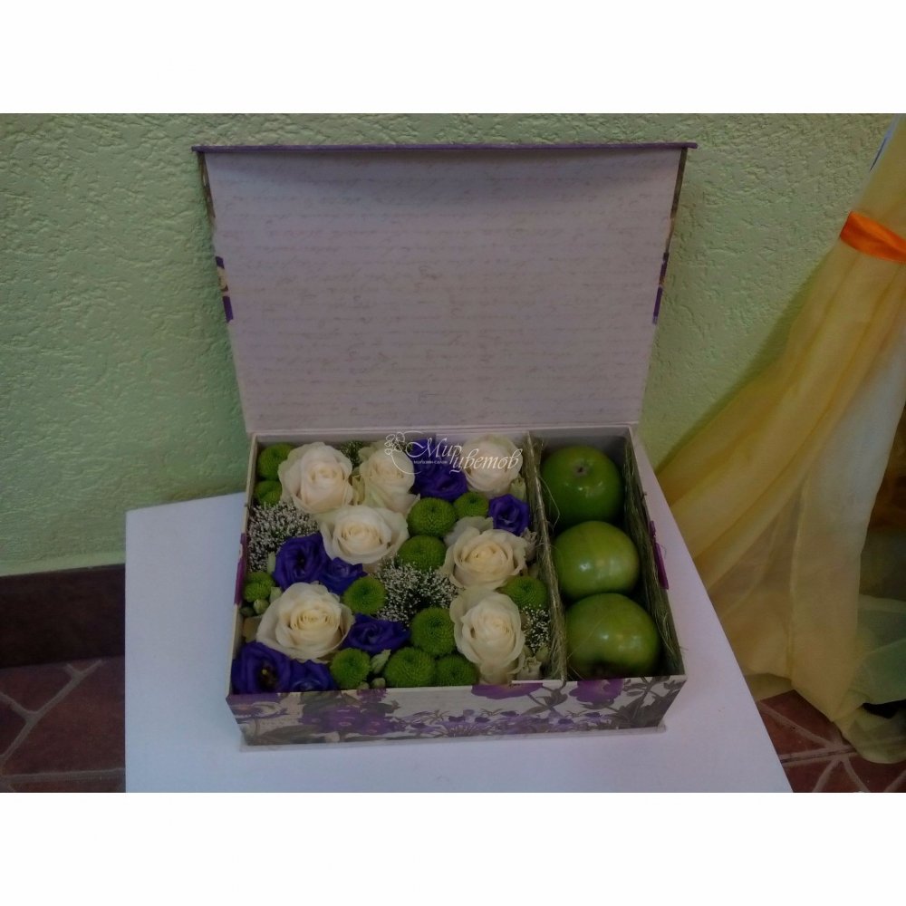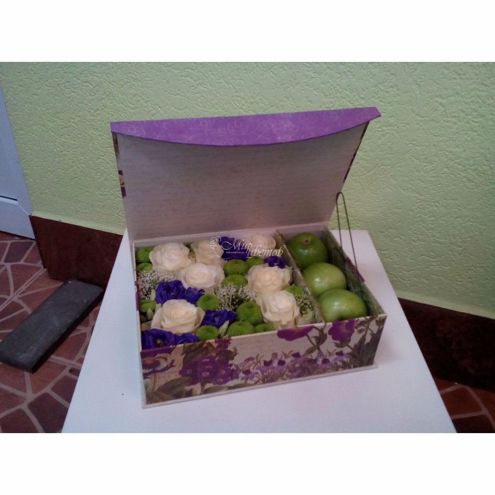 Коробка Роза белая - 7 шт Хризантема кустовая - 2 шт Эустома - 2 шт Трахелиум - 2 шт Яблоки или фрукты по вашему желанию