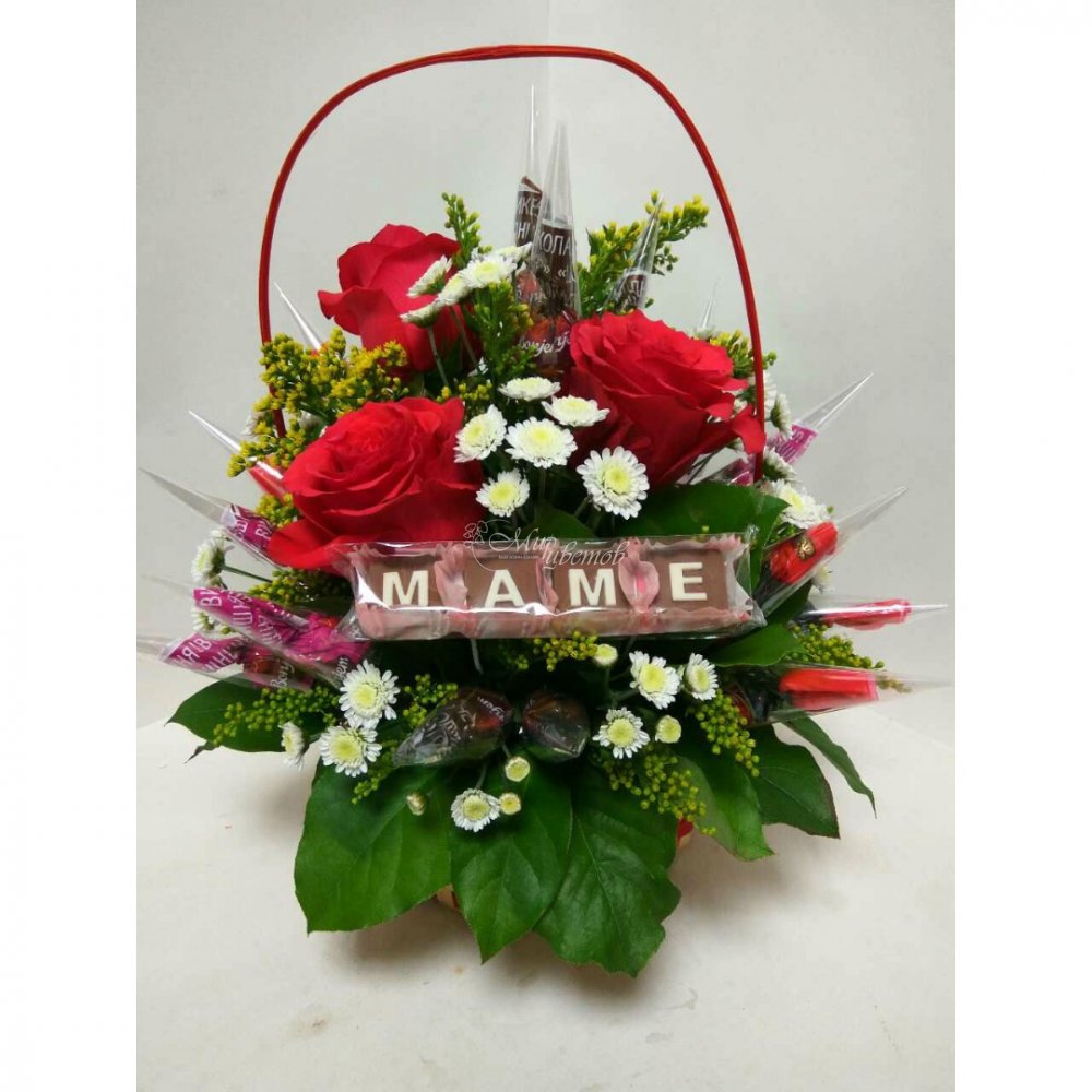 Корзина Шоколад можно заменить на "ЛЮБЛЮ"или конфеты шоколадные Роза Солидага Хризантема кустовая Зелень