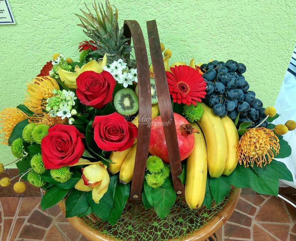 Корзина Фрукты Роза - 3 шт Гербера - 3 шт Леукосперикум - 4 шт Орнитагалум - 3 шт Хризантема кустовая - 3 шт Цимбидиум - 3 шт Краспедия - 12 шт Зелень