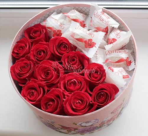 Ящик Роза - 3 шт Хризантема кустовая - 2 шт Гиперикум - 1 шт Эустома - 2 шт Салал Цветы в композиции могут быть заменены на равноценные, по усмотрению флориста.