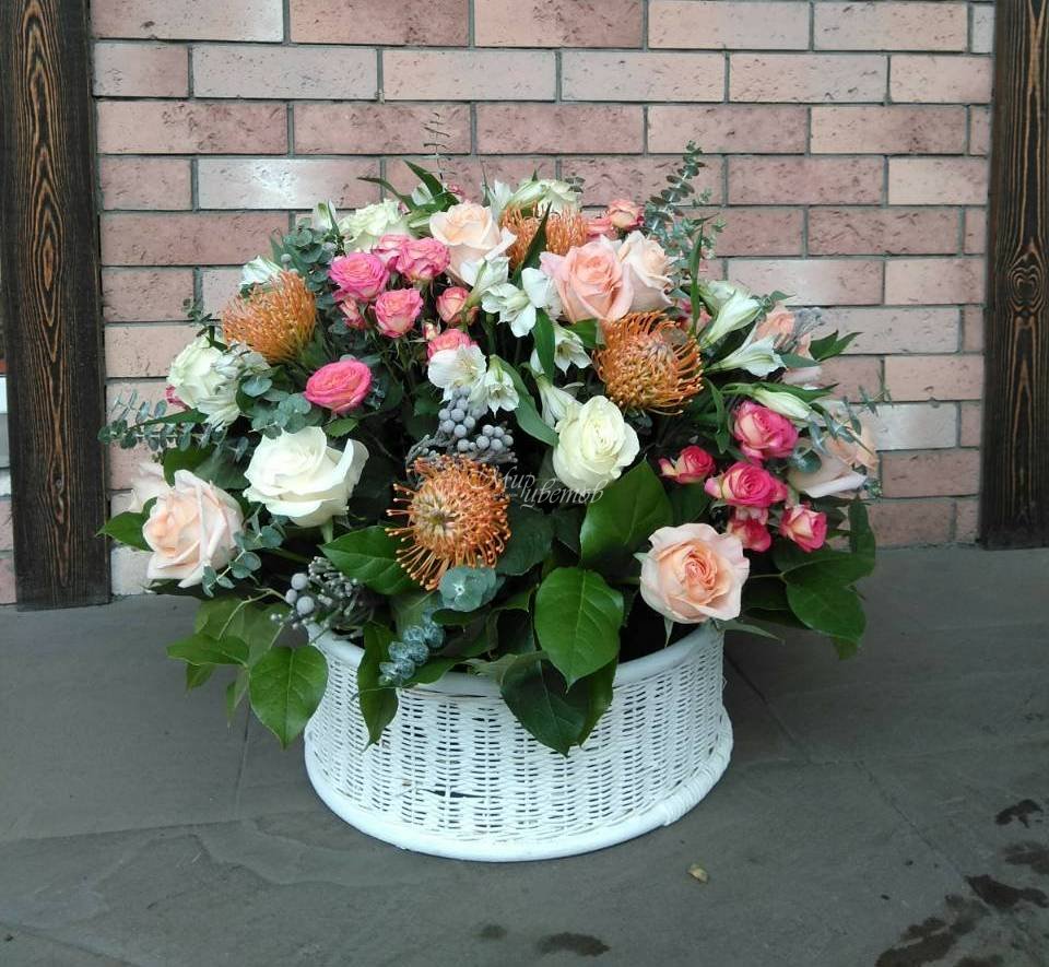 Корзина роза леукосперикум бруния роза кустовая эвкалипт альстромерия зелень