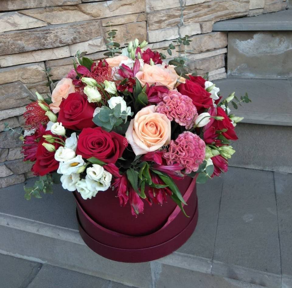 Коробка Роза Целлозия Альстромерия Эустома Эвкалипт Леукосперикум Зелень