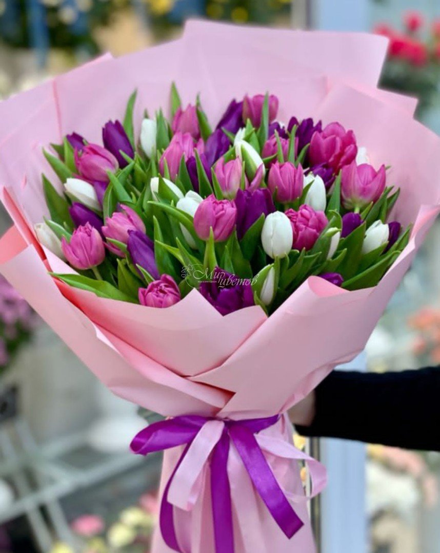 Тюльпан микс - 51 шт Пленка матовая лента атласная