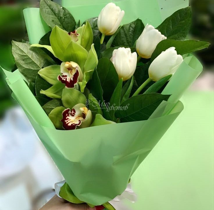 Тюльпан 4 шт Орхидея 3 шт Зелень Пленка матовая Лента атлас