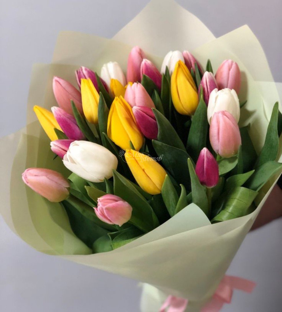 Тюльпан микс - 27 шт Пленка матовая Лента атласная