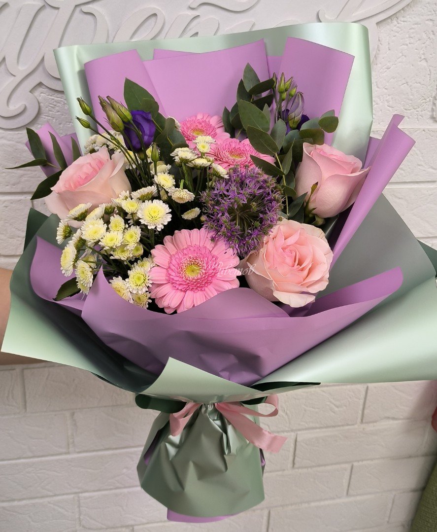 Роза Гербера Алиум Хризантема кустовая Эустома Эвкалипт Матовая пленка Лента атлас