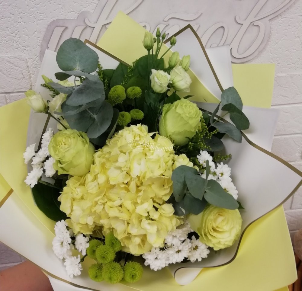 Гортензия Роза Хризантема кустовая Эвкалипт Солидага Зелень Матовая пленка лента атлас