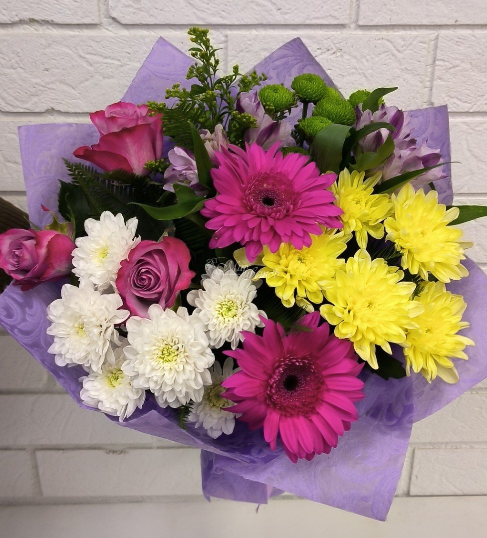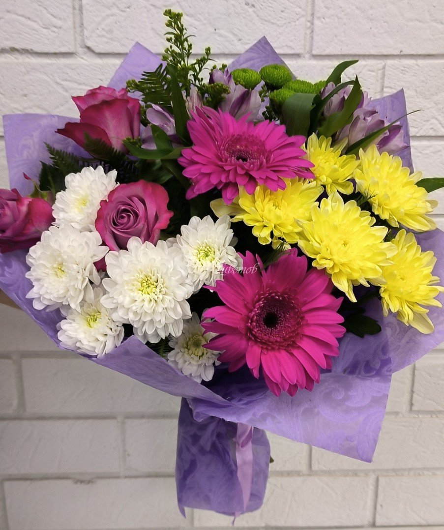 Гербера Роза Хризантема кустовая Трахелиум Зелень Пленка матовая Лента атлас