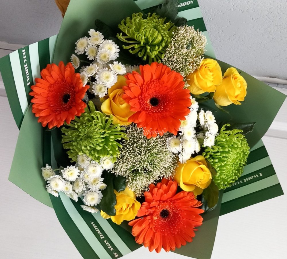 Роза Гербера Хризантема кустовая Хиперикум Трахелиум Зелень Пленка матовая Лента атлас