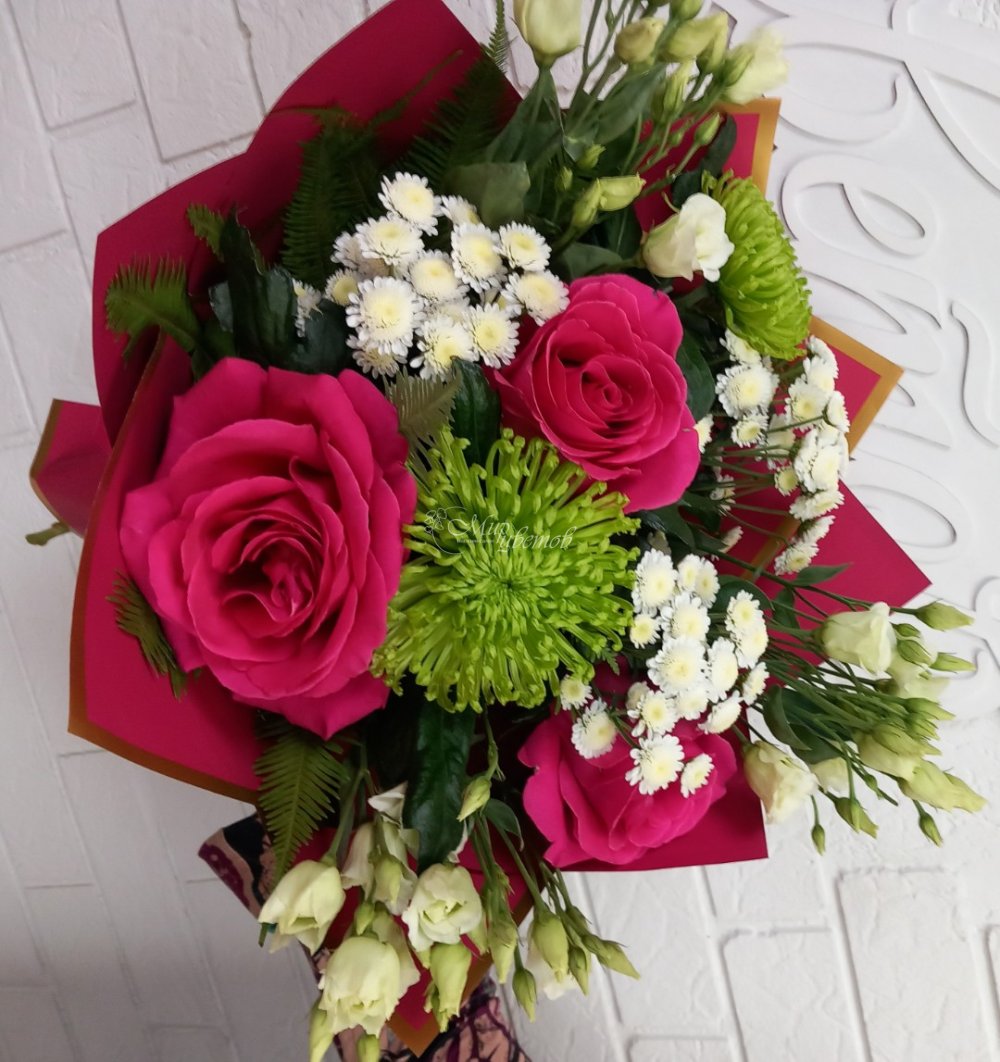 Роза Хризантема кустовая Хризантема Эустома Зелень Пленка матовая Лента атлас