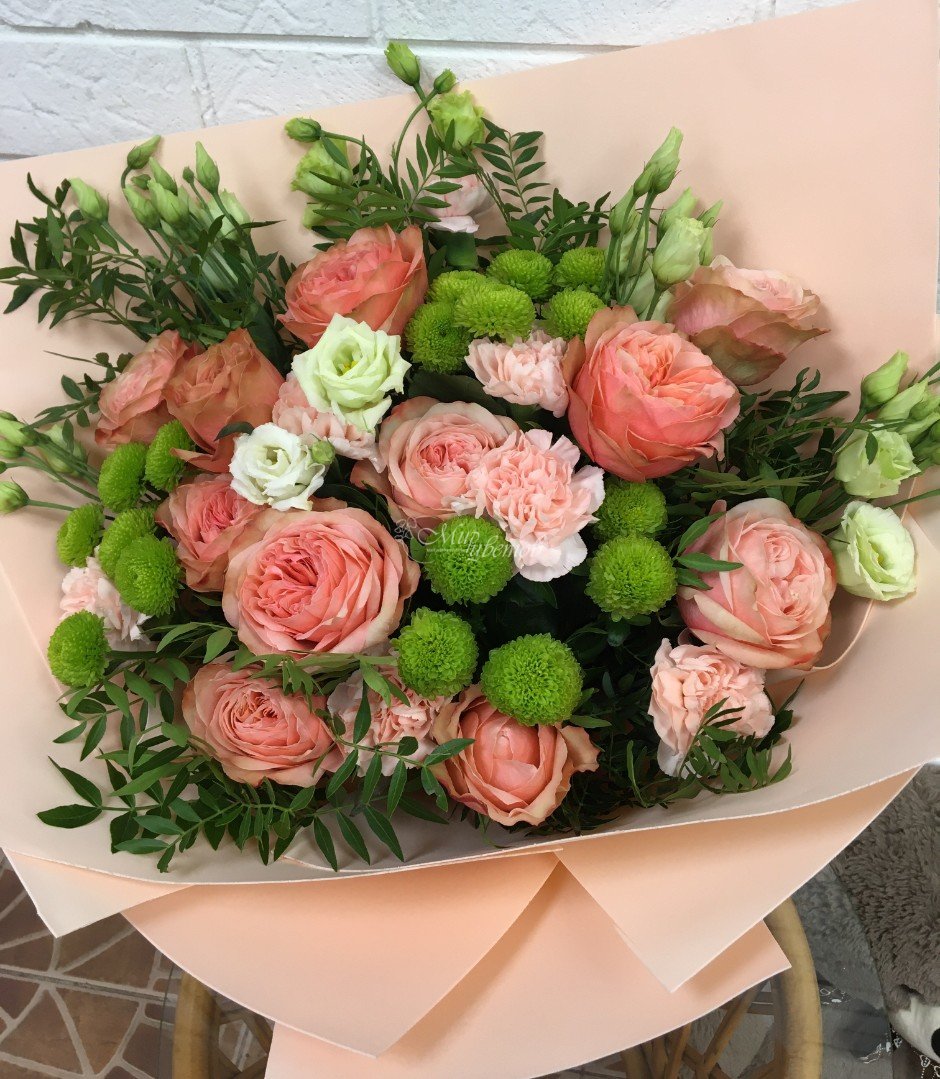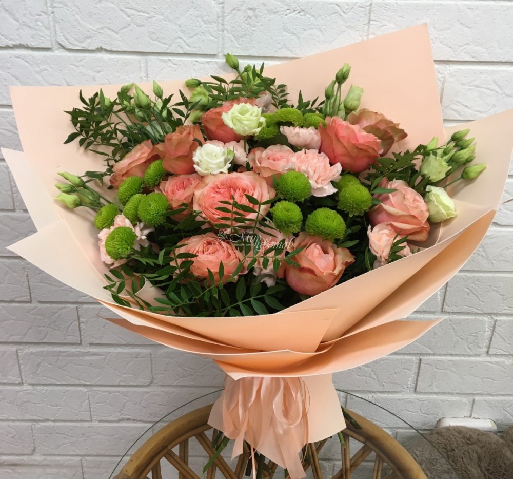Роза Гвоздика Хризантема кустовая Эустома Фисташка Упаковка фоамиран Лента атлас