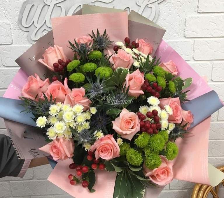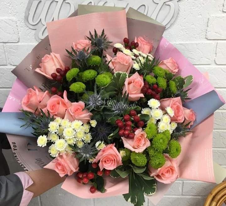 Роза Эрингиум Хризантема кустовая Гиперикум Зелень Упаковка пленка матовая Лента атлас