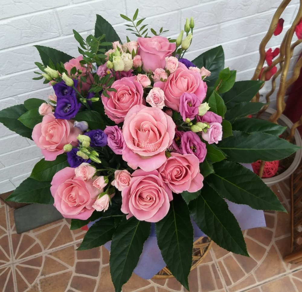Роза Эустома Зелень Фатсия Упаковка фетр Лента атлас