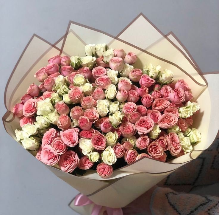 Розы Кустовые розы Герберы Альстромерии Гвоздики Зелень Пленка матовая Лента атлас